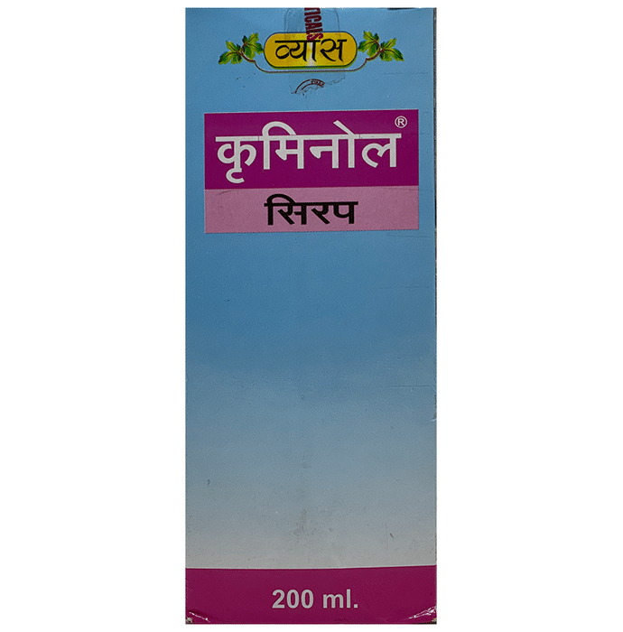 Vyas Kriminol Syrup is an ayurvedic proprietary medicine for worm infestation. It is an appetizer and digestive. It is very effective in removing worm infestations and also prevents further infestation. It works effectively as a digestive, appetiser and energizing tonic. | Key Ingredients: Ajamoda Haritaki-harad Kalijiri Nisoth Palas beej Saunf Vidanga Chini Sodium methyl paraben | Key Benefits: It helps detoxify the body of parasites and worm infestation It helps improve digestion and restores losing weight It eliminates parasitic symptoms like nausea, cramps to improve the overall well-being It also hinders the recurrence of eggs and further infestation | Directions For Use: For adults: 2 teaspoons thrice a day For children: 1 teaspoon thrice a day | Safety Information: Read the label carefully before use Do not exceed the recommended dosage Keep out of reach of children