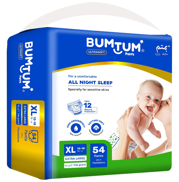 Bumtum Ultrasoft Pants (54 Each) XL Bumtum Ultrasoft Pants X Large There are parents who spend a fortune on diapers only to end up with a baby who is irritable, uncomfortable and cranky. As babies cannot convey their feelings, it is upto parents to figure out their little one’s needs. Bumtum ultrasoft diapers are designed to give superior absorbency and keep your little angel's skin dry all day long. The advanced double leak protection has made it the most preferred diaper pants.