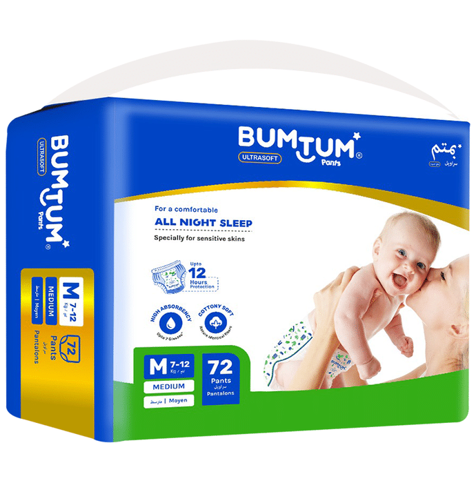 Bumtum Ultrasoft Pants (72 Each) Medium Bumtum Ultrasoft Pants Medium There are parents who spend a fortune on diapers only to end up with a baby who is irritable, uncomfortable and cranky. As babies cannot convey their feelings, it is upto parents to figure out their little one’s needs. Bumtum ultrasoft diapers are designed to give superior absorbency and keep your little angel's skin dry all day long. The advanced double leak protection has made it the most preferred diaper pants.