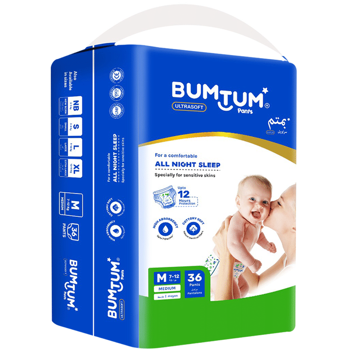 Bumtum Ultrasoft Pants Medium Bumtum Ultrasoft Pants There are parents who spend a fortune on diapers only to end up with a baby who is irritable, uncomfortable and cranky. As babies cannot convey their feelings, it is upto parents to figure out their little one’s needs. Bumtum ultrasoft diapers are designed to give superior absorbency and keep your little angel's skin dry all day long. The advanced double leak protection has made it the most preferred diaper pants.
