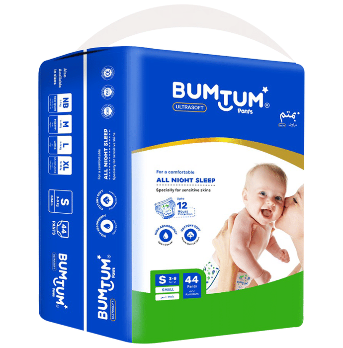 Bumtum Ultrasoft Pants Small Bumtum Ultrasoft Pants There are parents who spend a fortune on diapers only to end up with a baby who is irritable, uncomfortable and cranky. As babies cannot convey their feelings, it is upto parents to figure out their little one’s needs. Bumtum ultrasoft diapers are designed to give superior absorbency and keep your little angel's skin dry all day long. The advanced double leak protection has made it the most preferred diaper pants.