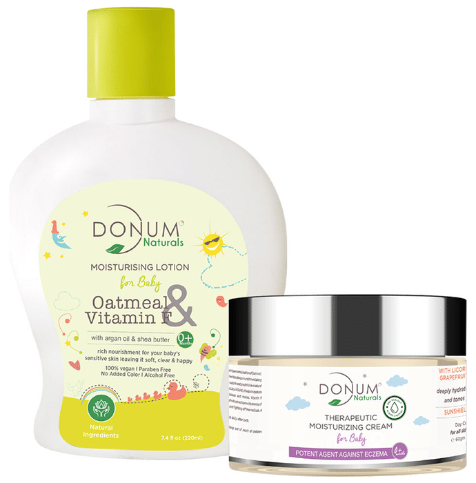 Donum Naturals Combo Pack of Oatmeal & Vitamin F Lotion and Therapeutic Moisturizing Cream for Baby Donum Naturals Combo Pack of Oatmeal Vitamin F Lotion and Therapeutic Cream for Baby contains extracts of natural ingredients like Oatmeal and Vitamin F and helps to hydrate baby’s sensitive skin without causing any irritation.