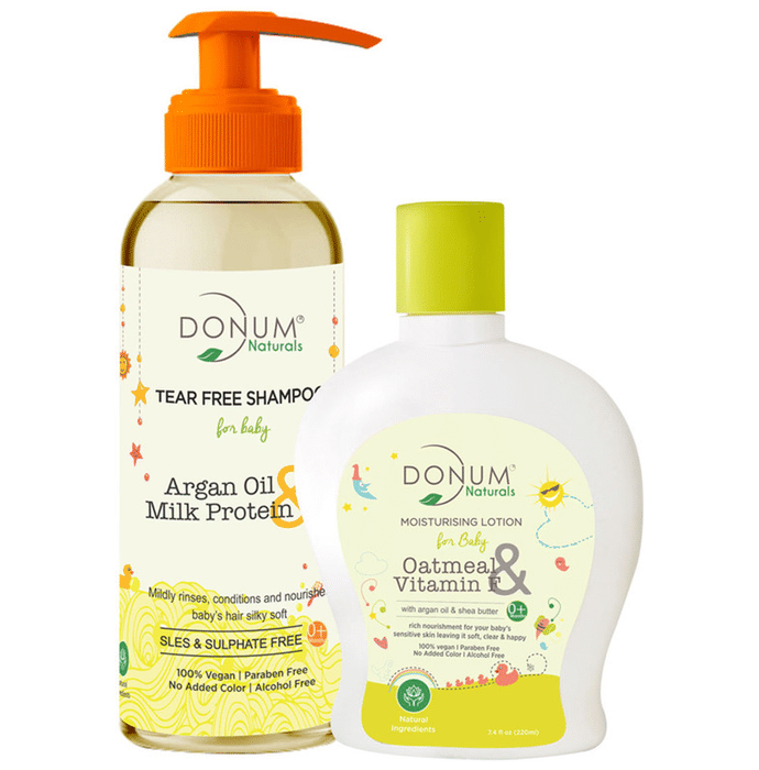 Donum Naturals Combo Pack of Tear Free Shampoo & Oatmeal Vitamin F Lotion for Baby is a combo product comprising of baby shampoo and baby lotion. Both these products are made from natural ingredients which are safe to use on the delicate skin of the baby. The tear-free shampoo is free from harmful chemicals and is made from coconut based and vegetable-derived cleansers which help in gentle cleaning of the scalp and hair. The body lotion contains natural ingredients which nourish the skin and make it soft, supple and healthy. | Key Ingredients: Argan oil Vitamin F Oatmeal Shea butter Coconut extract Milk protein | Key Benefits: It is a tear-free shampoo and is helpful in gentle hair cleansing without irritating eyes It helps in making soft and healthy hair, boosts hair growth, and assists in repairing damaged hair Body lotion moisturises, nourishes and restores the baby's delicate skin Body lotion also helps in fighting skin allergies and sunburns | Directions For Use: Apply a smidge of the shampoo on the baby's wet scalp Massage gently into a lather and rinse thoroughly with water After the bath, apply the baby lotion evenly on the baby's body Massage gently in circular motions till the skin absorbs it For best results, apply lotion twice a day | Safety Information: Read the label carefully before use Keep out of the reach of children Use under medical supervision Store in a place that is cool, dry and away from sunlight Only for external use