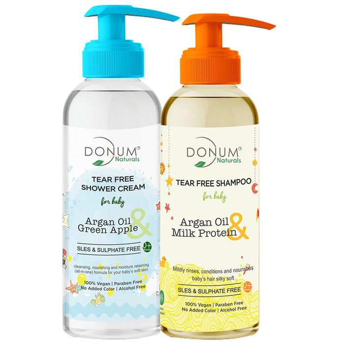 Donum Naturals Combo Pack of Tear Free Shower Cream & Tear Free Shampoo for Baby Donum Naturals Combo Pack of Tear Free Body Wash & Tear Free Shampoo for Baby is a pack of products that help them to stay nourished and clean. It helps in preventing burning of eyes or tear while taking showers. It is also safe for their skin and hair.