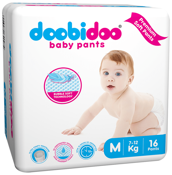 Doobidoo Premium Baby Pants Medium Diaper Doobidoo Baby Pants comes with a breathable cover that allows a free flow of air to keep your baby's skin fresh and dry. The super stretchable elastic waistband reduces friction and prevents redness around the waist. Its bubble soft technology comes with a 3D perforated feather top sheet which is very gentle on the skin. These Baby Pants have unique hexagonal channels that quickly draws the liquid and lock away the wetness.