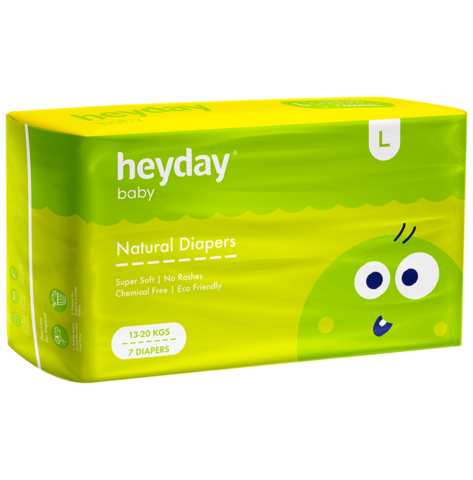 Heyday Natural Baby Diaper Large Heyday Natural Baby Diaper are made from plant fibres and have a highly absorbent core. Every diaper has double leak guards, wetness indicators, snug fit pant design and super soft top sheet.