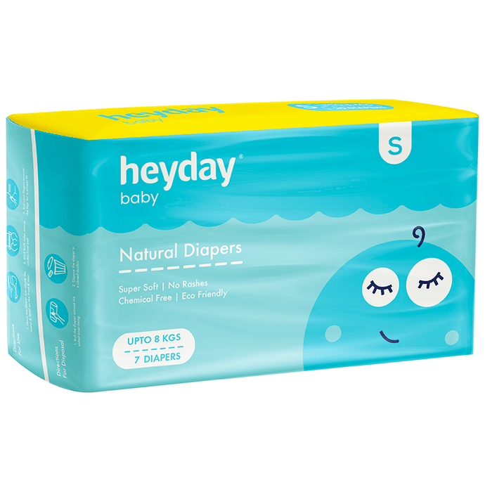 Heyday Natural Baby Diaper are made from plant fibres and have a highly absorbent core. Every diaper has double leak guards, wetness indicators, snug fit pant design and super soft top sheet. | Uses: It is primarily used to maintain personal hygiene by absorbing urine and keeping the skin rash free. | Product Specifications and Features: It is suitable for baby weight up to 8 kg It is made from plant fibres with no chemicals, plastics or toxins It allows easy airflow without rashes, allergies, skin irritation and redness It has a 360* biocomposite absorber for dry and safe protection It has a snug fit pant design with a stretchy waistband for easy movement It has three wetness indicator lines for convenient changes (turns from yellow to blue every time the baby urinates It has 2-year biodegradability It is easy to dispose of with household waste or in a compost pit | Directions For Use: Place the baby diaper just above the navel and level on the front and rear Tape both the ends of the diaper across the front belt Run your fingers around the baby's legs for a proper fit | Safety Information: Read the label carefully before use Store in a cool and dry place away from direct sunlight Keep out of reach of the children