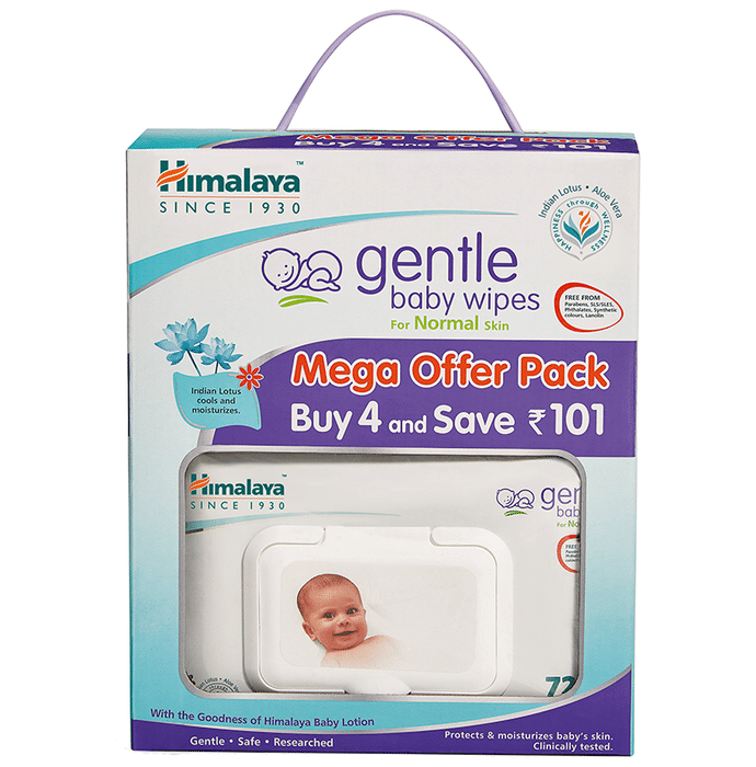 Himalaya Gentle Baby Wipes (72 Each) Mega Offer Pack with Lid Gentle Baby Wipes is infused with the goodness of Aloe Vera and Indian Lotus extracts, Himalaya Gentle Baby Wipes are mild enough to soothe baby's bottom during a diaper change. The wipes can also be used to gently cleanse baby's skin. Ideal for use when traveling.