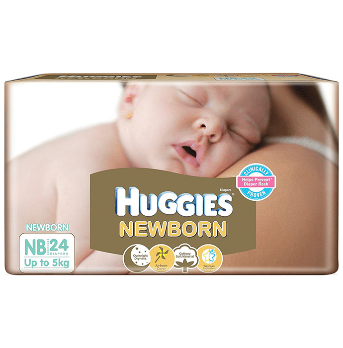 Huggies New Born baby diapers is ideal for New born babies. Weight: Upto 5kgs Pack:24 Superior absorbency for overnight dryness Airfresh cover that keeps the skin fresh by allowing free flow of fresh air Cottony Soft Material that is gentle on the skin Wetness Indicator in the form of yellow stars that turn blue to indicate urination Clinically Proven to prevent diaper rash