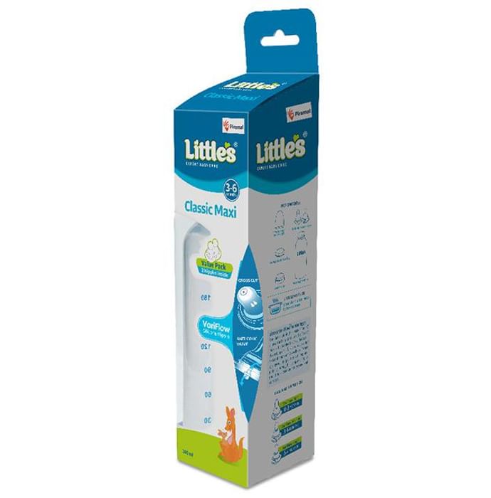 Little's Classic Feeding Bottle Maxi Blue Little's Classic Feeding Bottle are premium feeding bottles with multifunctionality. It comes with two variflow nipples that have patented cross-cut technology that helps prevent leakage and colic. Linear marks regularize milk flow even when the nipple is bitten by the baby. It is made of polypropylene material that makes the bottle sturdy BPA free.