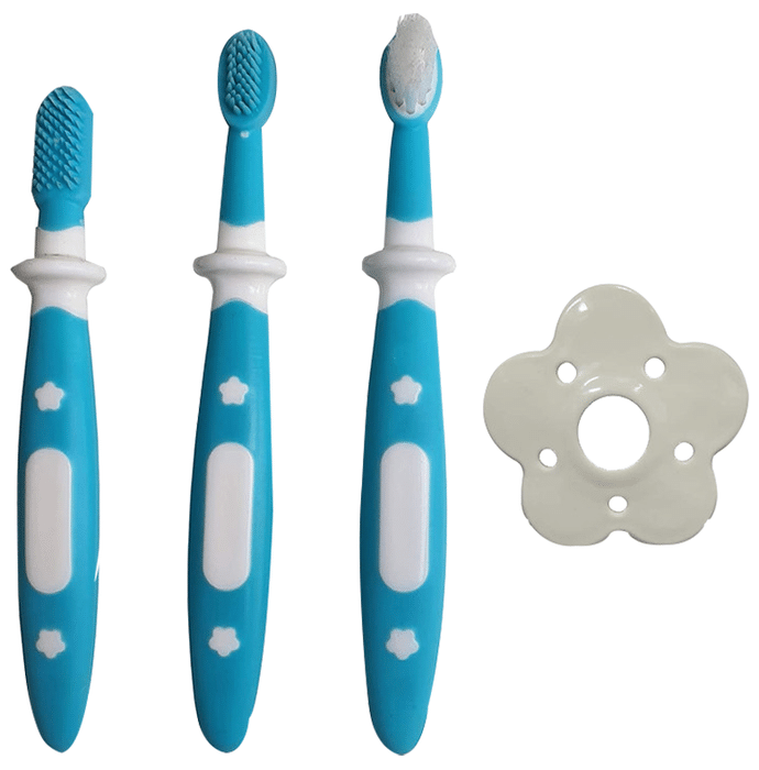 LuvLap Baby Training Toothbrush Set 6m+ comes with a 3 stage training toothbrush set with soft grip handles and safety. The anti-choking shield helps infants develop safe and healthy oral care routines. | Uses: It is used to clean teeth and feels good on the baby's gums. It helps to keep the baby's teeth healthy and clean. | Product Specification and Features: The toothbrush set has fine gentle bristles and comes with a non-slip handle with a soft grip It has a removal anti chocking safety, soft elastomer rubber hand that is safe and non-toxic 100% soft silicone and BPA free food-grade plastic The removable shield fits firmly on all toothbrushes All brushes come with tongue cleaner at the back | Directions For Use: The unique toothbrush set fits into the palm while brushing. | Safety Information: Read the label carefully before use Keep out of reach of the children Store in a cool dry place A toothbrush can not boil, microwave or disinfectant using a liquid