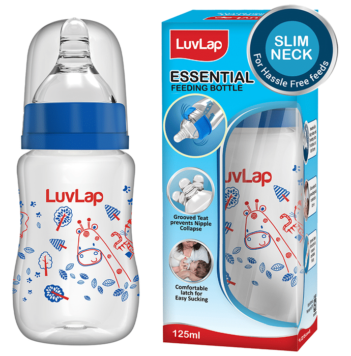 LuvLap Essential Feeding Bottle Slim Neck 0m+ LuvLap Essential Feeding Bottle Slim Neck 0m+ (125ml Each) comes with a slow-flow teat designed to feed the baby with utmost care and slowness. The bottle bears a slim neck to provide the experience of hassle-free feeding.