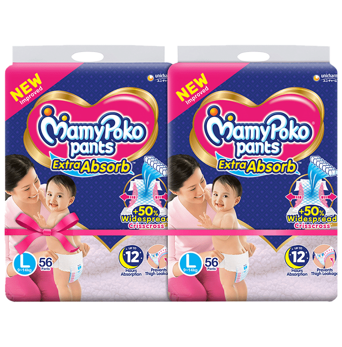 Mamy Poko Extra Absorb Diaper Pants (56 Each) Large are designed with a 50% widespread crisscross sheet that enables quick absorption of urine. It has several variants to accommodate babies across a wide range of weights. These pant style diapers offer up to 12 hours of mess-free absorption, making your baby comfortable and dry. | Uses: It is used to absorb excess leakage to keep the baby’s skin fresh and dry | Product Specification and Features: Its new thin, comfortable core provides up to 12 hours of absorption and keeps your baby dry the whole night It is easy to fit and gentle on your baby's skin Its breathable material keeps your baby fresh and comfortable Mamy Poko Pants Extra Absorb comes with exciting designs in a single pack. Give your baby a happy diaper experience! | Directions For Use: Read the label carefully | Safety Information: Do not flush the diaper Do not use the diaper again Keep out of the reach of children
