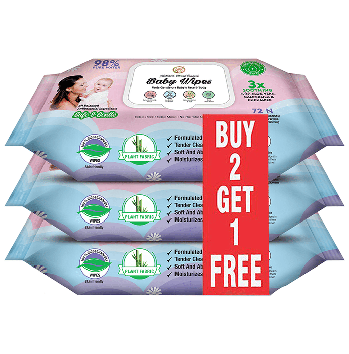 Mom & World 98% Pure Water Baby Wipes (72 Each) Buy 2 Get 1 Free Mom & World 98% Pure Water Natural Plant-Based Baby Wipes contains the goodness of aloe vera, cucumber and calendula that maintains the ph balance and hydrates the baby's skin. It is super soft on the skin and also protects the baby's skin from rashes.