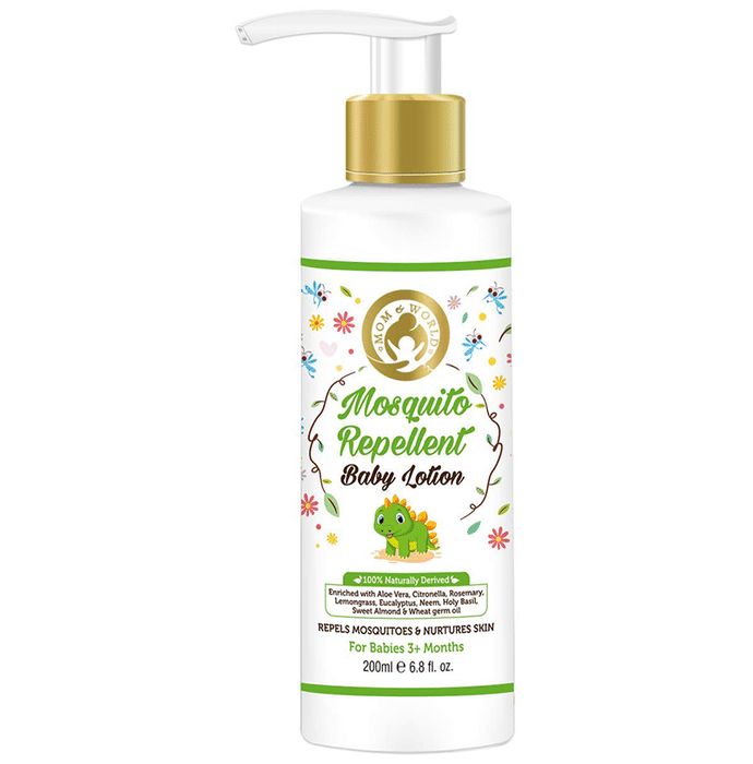 Mom & World Mosquito Repellent Baby Lotion Mom & World Mosquito Repellent Baby Lotion can be effective in protecting your body from mosquito bites that could result in infections, rashes and severe ailments. It is a dermatologically tested vegan lotion, free of paraben, cruelty and SLS. The composition can help ward off insects by masking the body odour.