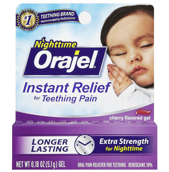 Nighttime | Orajel Instant Relief Dental Gel is a benzocaine free formula that helps in soothing the baby's teething gums in the night during bedtime. It is useful in providing relief from swollen gums due to teething in children. | Key Ingredients: Benzocaine Propylene Glycol Glycerin Cellulose Gum Poloxamer 407 Chamomile Potassium Sorbate Simethicone Sodium Saccharin Citric Acid | Key Benefits: Provides an instant cooling sensation Helps soothe teething gums This gel is free from benzocaine Proivdes relief from swollen gums Free of artificial colours, menthol, sugar and parabens | Directions for Use: Before applying, wash your hands. Then, cut open the tip along the score mark Using your fingertip or cotton applicator, spread a pea-size amount of gel over your baby's gums before bedtime | Safety Information: Read the label carefully before use Keep out of the reach of children Store in a cool dry place away from direct sunlight Recommended for babies above 3 months old