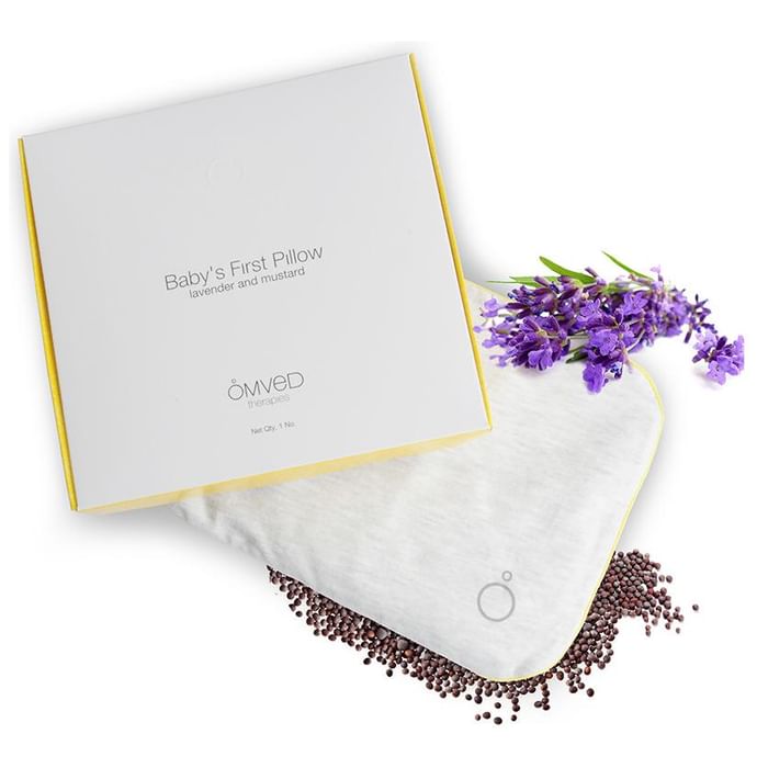 Omved Baby First Lavender & Mustard Pillow Medium Omved Baby First Lavender & Mustard Pillow gives the newborn baby complete support during sleep. Filled with Mustard Seeds, Omved Baby Pillow helps to conform to head shape, allows air circulation and prevents flat head syndrome. While offering complete comfort to your baby, it prevents flat head syndrome (Plagiocephaly) by evenly distributing pressure around baby's delicate head.