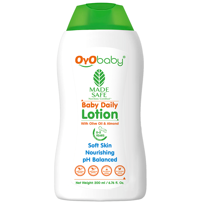 Oyo Baby Baby Daily Lotion with Olive Oil & Almond Oyo Baby Baby Daily Lotion is a nutrient rich blend of essential oils and ingredients like almond, shea butter, and giloy that hydrate the baby’s skin from within and keep it healthy. Enriched with vitamins, this lotion keeps the skin nourished and supports the skin’s protective barrier by forming a thin layer. It does not irritate the baby’s skin and maintains its pH balance. The lotion is free from SLS, parabens and cruelty and is safe to use.