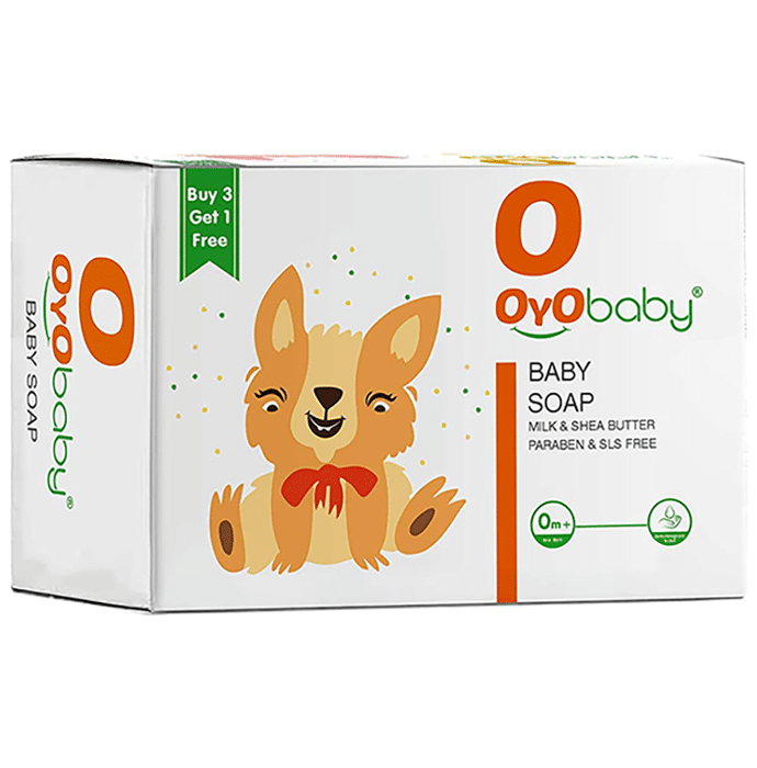 Oyo Baby Milk & Shea Butter Baby Soap (75gm Each) Buy 3 Get 1 Free Oyo Baby Milk & Shea Butter Baby Soap is curated using natural ingredients like shea butter and milk that are ideal for a baby’s gentle skin. It is a tear-free formula that does not irritate the eyes or sensitive skin of the baby. The natural nutrients present in milk get easily absorbed into the delicate skin of the baby and keeps it moisturised for a long time. Milk also helps in soothing the dry and itchy skin of babies. This soap is free from parabens, animal fats and synthetic colours.
