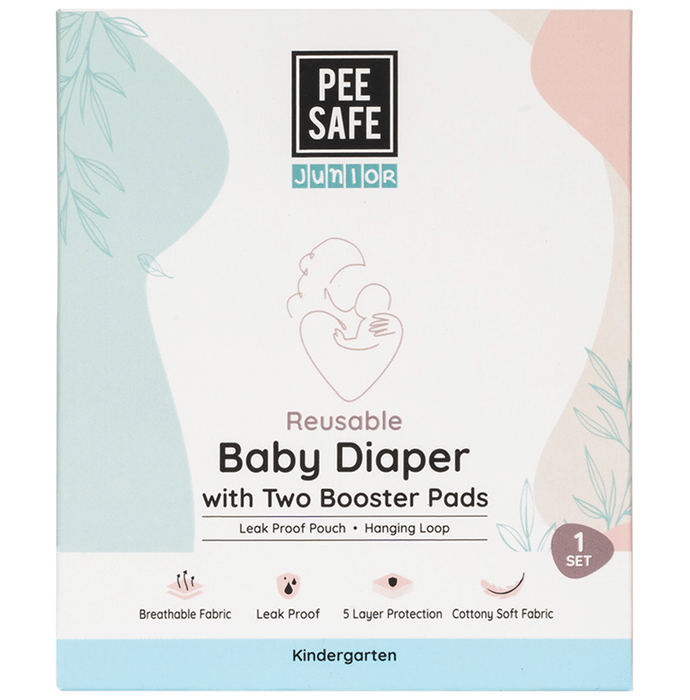 Pee Safe Junior Reusable Baby Diaper Pads with Two Booster Pads are made from soft fleece, providing comfort to the baby. These diapers offer maximum absorption and protection against leaks all day long. The comfortable soft fabric is breathable and allows the baby to move freely. The diapers have a leak-proof storage pouch for safekeeping and a hanging loop for drying after washing. | Uses: The diaper can be used to prevent leakage, wetness, and odour. | Product Specifications and Features: The diapers are made with soft fabric that provides comfort They have 5-layer protection to provide a leak-proof experience The booster pad and the diaper can be washed and reused The diapers have adjustable sides | Directions For Use: Lay the diaper flat. Hold the booster pad and place it inside the diaper for maximum absorption To have the perfect fit, use buttons to adjust the length of the diaper Gently place the baby on top of the diaper Adjust the size by wrapping it around the waist Snap the waist buttons on both sides of the toddler | Safety Information: Do not iron Do not bleach Do not dry clean Do not use hard detergent