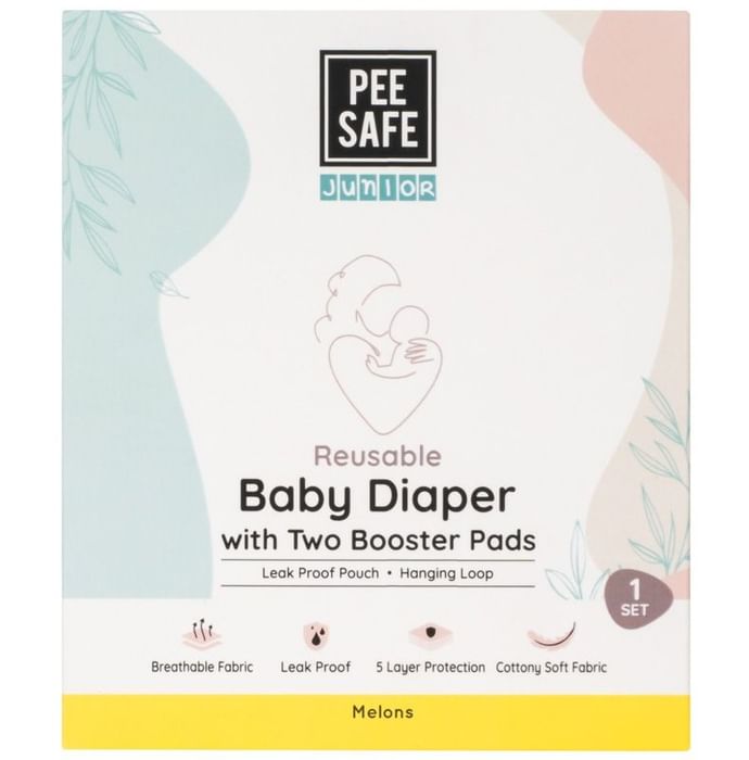 Pee Safe Junior Reusable Baby Diaper Pads with Two Booster pads Melons Pee Safe Junior Reusable Baby Diaper Pads with Two Booster Pads are made from soft fleece, providing comfort to the baby. These diapers offer maximum absorption and protection against leaks all day long. The comfortable soft fabric is breathable and allows the baby to move freely. The diapers have a leak-proof storage pouch for safekeeping and a hanging loop for drying after washing.