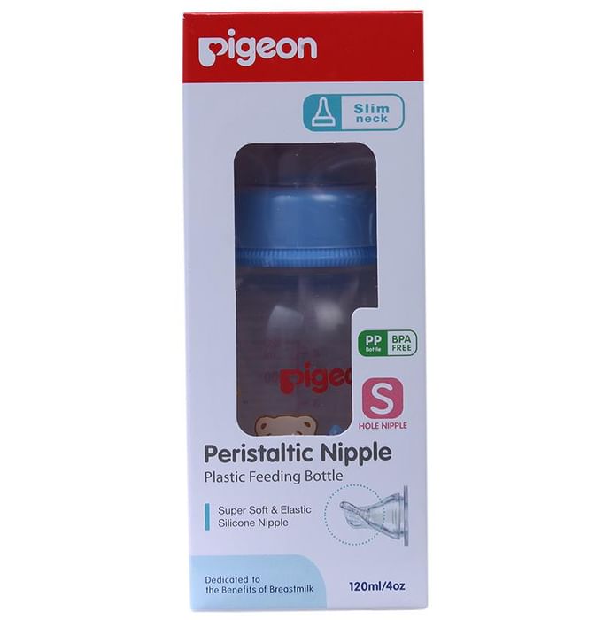 Pigeon Peristaltic Nursing Bottle Small Blue Pigeon Peristaltic Nursing Bottle is specially designed projections at the base and the top of the teats allow milk to flow smoothly into the baby mouth. It helps to adjusts air pressure inside the bottle. Salient features of Pigeon Peristaltic Nursing Bottle: Made of high quality durable plastic, the streamlined shape makes it easy for mothers to hold and keep clean. Encourage baby's natural tongue movement. Ensures ideal softness and elasticity so that your baby can latch on comfortably and easily. The shape fits perfectly onto your baby's tongue, allowing smooth tongue movement and minimizing air intake. The adjustment of the air pressure inside the bottle minimizes air intake when feeding. Hence, baby will not swallow excessive air bubbles with milk.