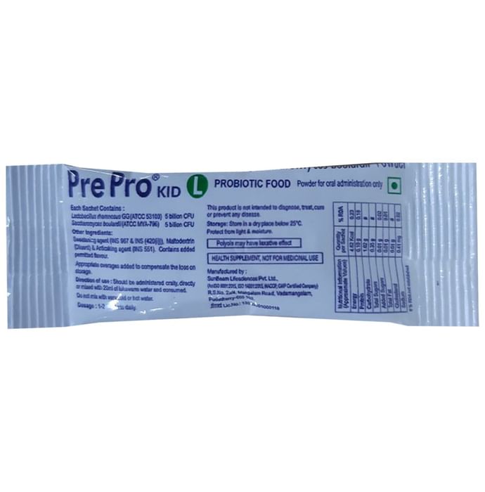 Pre Pro Kid L Powder Pre Pro Kid L S achet is specially designed for children with the world’s most researched probiotics strains Lactobacillus rhamnose GG & S. boulardii. The human body has a healthy community of microorganisms which is essential for healthy functioning of the gastrointestinal tract. Any disturbance caused to these community of microorganisms is called dysbiosis which leads to various disease conditions like diarrhoea. Antibiotics also cause diarrhoea by disturbing a healthy community of microorganisms. Few children are unable to digest dairy products due to insufficient amount of lactase, this condition is called as lactose intolerance which is associated with diarrhoea in children.