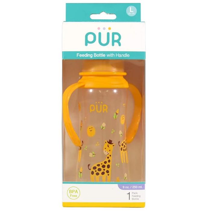 Pur Shaped Feeding Bottle with Handle can be an effective tool for moms to manage infants with flat, inverted and sore nipples. It offers a durable, comfortable and convenient way to make breastfeeding easier. | Uses: It allows you to feed your baby naturally throughout every growth phase. | Product Specifications and Features: It helps reduce feeding problems, helps digestion and helps preserve vitamins It is portable, light in weight, and can be reused It comes with the medium flow teat It comes with a handle | Directions For Use: Use as directed on the label. | Safety Information: Read the label carefully before use Store in a cool dry place away from direct sunlight Keep out of reach of the children