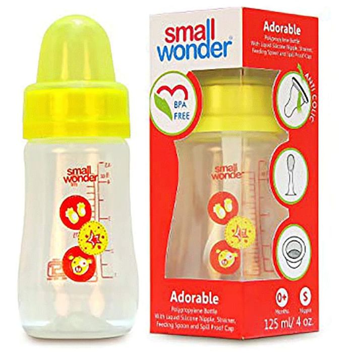 Small Wonder Adorable Bottle is a small bottle specially designed for your toddler. The bottle is designed to assist and provide easy sucking of the fluids and juices from the bottle so that the baby does not experience colic pain. Uses: The bottle is designed for toddlers in order to make consuming fluids and juices easy and painless for them. | Product Specifications and Features Material: Highest quality food-grade material Unique Feature: Anti-Colic Liquid Silicone Nipples Sealing Disk that avoids any sort of spillage Spill Proof Cap The bottle comes with additional accessories such as a strainer and feeding spoon It comes with a small vent that helps minimize colic as when the kid sucks the content from the bottle it creates pressure in such a way that it doesn't strain the baby Ensures that there is no leakage Contains a strainer that helps remove any sort of pulpy stuff or undissolved constituents of the baby formula Helps the baby to come into the practice of using a spoon post being habitual to nipple feeding | Directions For Use: Use the Small Wonder Adorable Bottle as directed on the label Safety Information: Read the label carefully before use Make sure the bottle is washed with warm soapy water