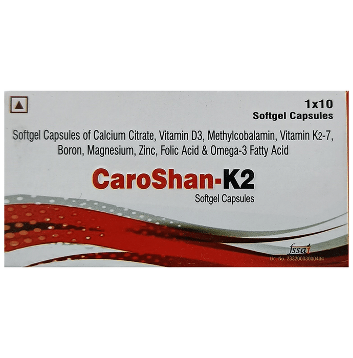 CaroShan-K2 Softgel Capsule It is a dietary supplement formulated with calcium citrate, vitamin D3, vitamin K2, methylcobalamin and other ingredients that promote bone and joint health. It helps in muscle contraction, muscle building and flexibility of joints. Vitamin D3 may help improve bone health and lower osteoporosis risk. Methylcobalamin is an essential nutrient that helps keep the body's nerves and blood cells healthy. | Key Ingredients: Calcium citrate Methylcobalamin Magnesium Zinc Vitamin D3 Vitamin K2-7 Folic acid Omega-3 | Key Benefits: It is a dietary supplement that supports bone and joint health Calcium citrate malate boosts collagen synthesis, aids muscle function, helps build muscle strength and enhances recovery Vitamin D3 can help improve bone density, bone strength and muscle functions Vitamin D helps efficient absorption of calcium by the body Calcium helps maintain normal heart rhythm and muscle contractions along with building bones Methylcobalamin is an essential nutrient that helps keep the body's nerves and blood cells healthy | Directions For Use: Use as directed on the label or as advised by your physician | Safety Information: Read the product label carefully before use Store in a cool and dry place away from direct sunlight Keep out of reach of children Consult a doctor before taking any supplement Do not exceed the recommended dosage Pregnant or nursing mothers, children, and people with medical conditions must consult a physician before taking this supplement