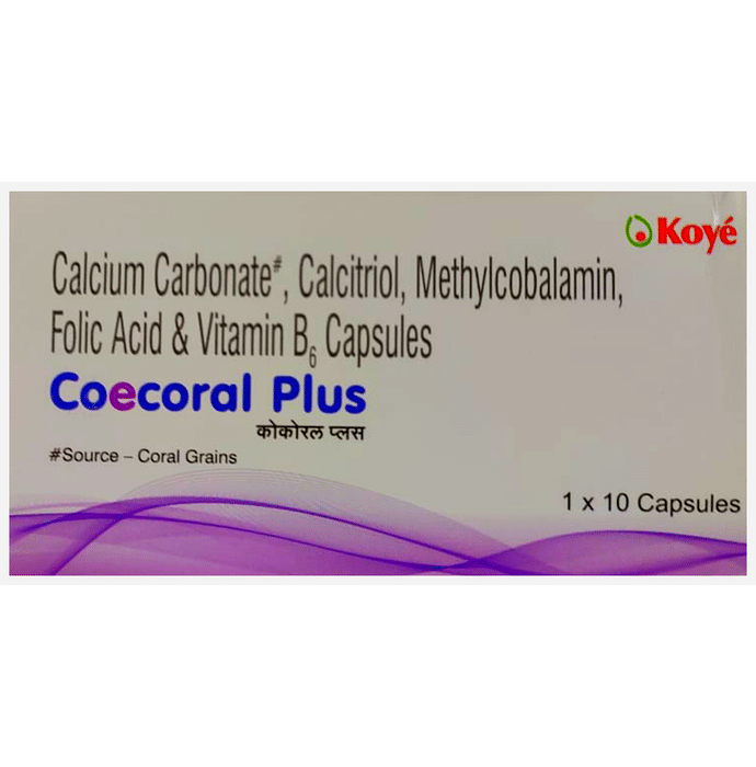 Coecoral Plus Capsule Coecoral Plus Capsule mainly contains Calcium, Folic acid, Vitamin B6, Mecobalamin. It provides essential minerals which are helpful in formation of bone. Coecoral Plus Capsule ensures proper supply of calcium required for the formation of bone. It is helpful in preventing bone breakage specially of spine bone. It is used as Supplementation of calcium during lactation and pregnancy, Hypocalcemia, Osteomalacia, Osteoporosis and other calcium deficiency diseases. It is also used in treatment of calcium deficiency, rickets, chronic renal failure, skin irritations, minor skin infections etc. Coecoral Plus are used for maintaining good health for blood cells, nerves and your proper body metabolism. They are also helpful in promoting healthy functioning of reproductive system. It is helpful in treatment of blood loss, anemia in older patients, for boosting mood, energy, concentration, improved immune system, asthma, allergic disorders. Use under medical supervision.