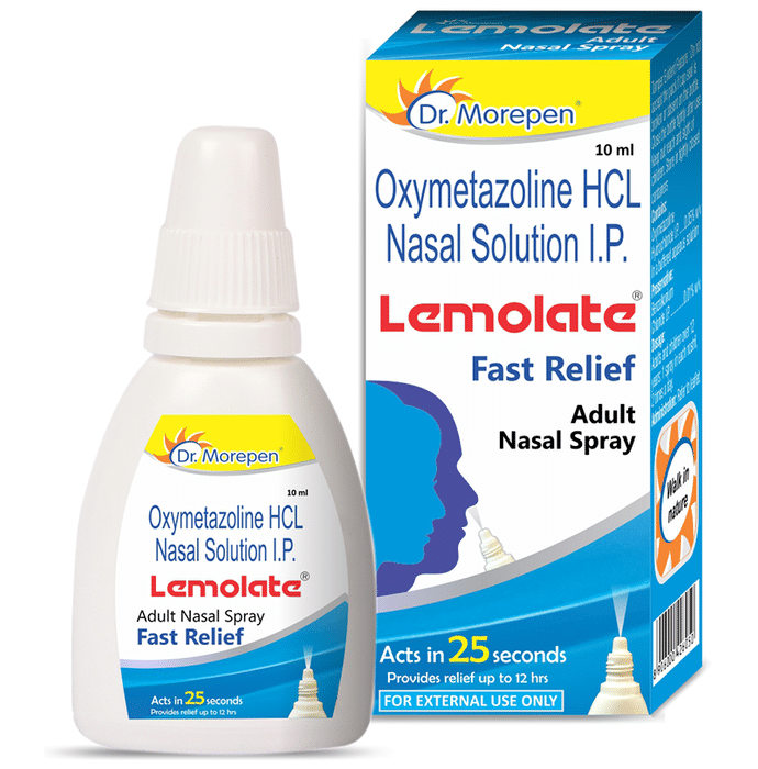 Dr Morepen Lemolate Fast Relief Adult Nasal Spray helps in providing effective relief from blocked nose. It is a fast-acting formula which starts to unblock the nose in seconds. It helps in reducing excess nasal secretions and relives swollen blood vessels. | Key Ingredients: Oxymetazoline Hydrochloride | Key Benefits: The nasal spray helps in unblocking nasal congestion It helps in reducing excessive nasal secretion Relieves swollen blood vessels in the nose It can be used for relieving congestion caused due to Sinusitis or other allergies | Directions For Use: Use as directed by the physician. | Safety Information: Read the label carefully before use Store in a cool and dry place away from direct sunlight Keep out of reach of the children