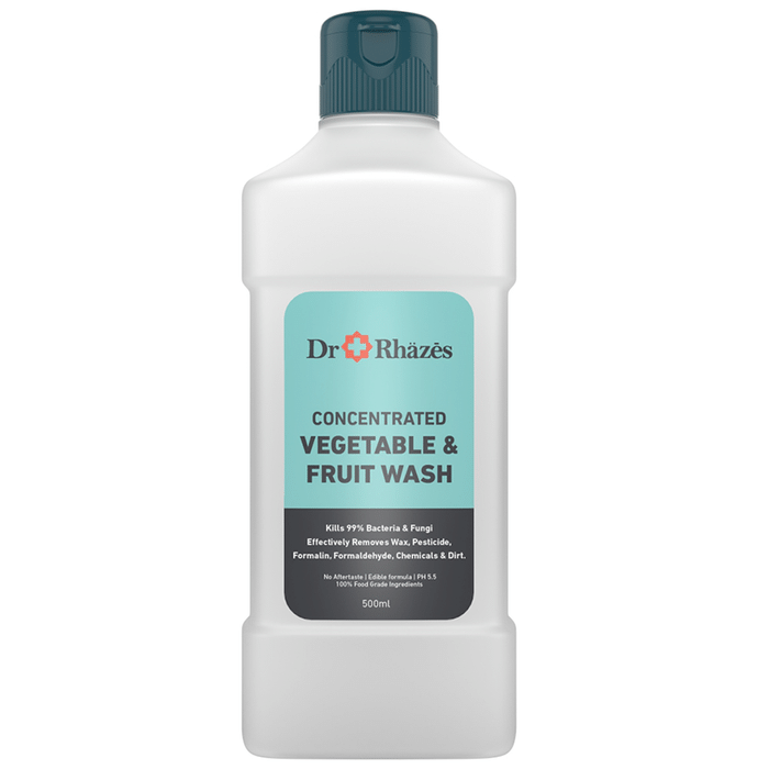 Dr Rhazes Concentrated Vegetable & Fruit Wash helps to thoroughly clean or sanitize the veggies and fruits before eating or cooking food. | Key Ingredients: Polysorbate Glycerine Sodium chloride Vinegar Citric acid | Key Benefits: Kills 99.9% bacteria and fungi on vegetables and fruits Removes wax, pesticides, chemicals, dirt and other impurities Requires just a few minutes of soaking Made from 100% food-grade ingredients It is a pH-balanced formulation with no SLS/SLES cleaning agents It helps retain the freshness of fruits and vegetables | Directions For Use: Use as directed on the label. | | Safety Information: Read the label carefully Store in a cool and dry place Keep out of the reach of children