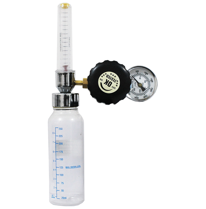 Fidelis Healthcare Brass Nickel Plated Oxygen Rotary Regulator is used to reduce gas pressure and adjust gas volume, which saves patients. An oxygen flowmeter is a piece of equipment used to regulate the flow of oxygen in patients receiving oxygen therapy. | Uses It is used to control the amount of oxygen delivered to patients receiving oxygen therapy. | Product Specifications and Features: Fidelis Healthcare Brass Nickel Plated Oxygen Rotary Regulator is used to rescue patients and provides them with oxygen therapy It also helps to clean the gas and the reducing valve lowers the tank pressure to a safe working level for user safety It can filter the impurities due to the presence of metalcore and a copper filter | Directions For Use: Use as directed on the label or as advised by the physician. | Safety Information: Read the label carefully before use Store in a cool and dry place away from direct sunlight Keep out of reach of children