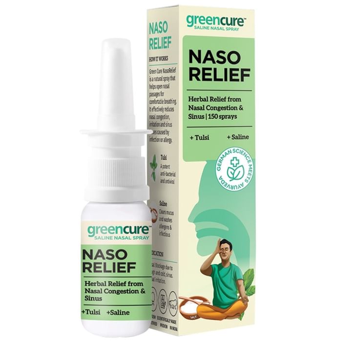 Greencure Naso Relief Saline Nasal Spray Greencure Naso Relief Saline Nasal Spray is a unique herbal solution for nasal congestion relief. Its unique, user-friendly spray design means you may breathe freely without affecting productivity during the day or sleep during the night. The solution relaxes the airway to improve by washing out allergens and inflammatory substances and increasing mucus production.