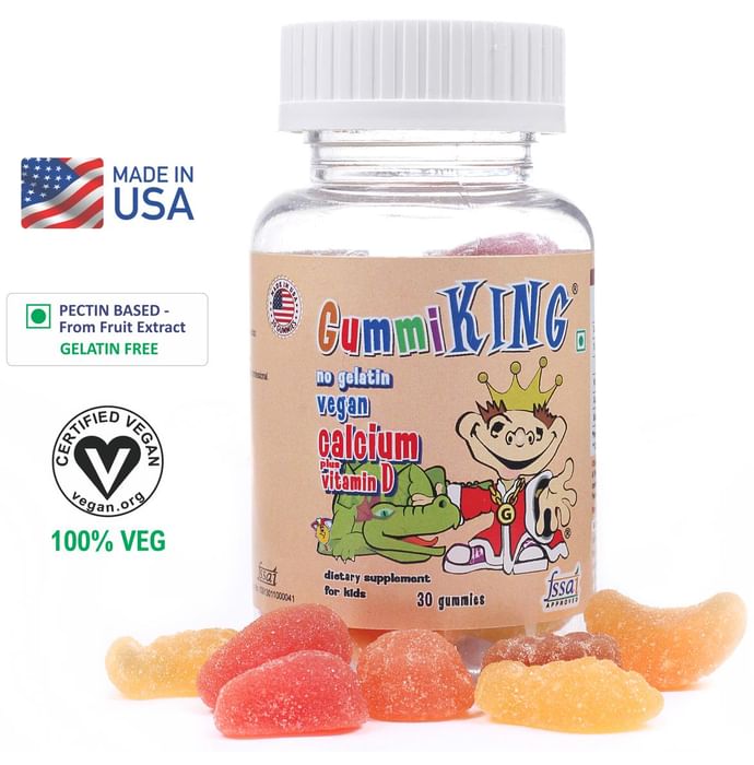 Gummiking Calcium Plus Vitamin D Formula for Bone, Health & Development Gummy contains Vitamin D2, Calcium etc. as major ingredients | - Gummies are made with only the highest quality ingredients. | - Enjoyable alternative to pills and tablets or dry chalky vitamins. | - Gummiking Calcium Plus Vitamin D Formula for Bone, Health & Development Gummy comes in six natural fruit flavours (strawberry, lemon, orange, grape, cherry & grapefruit) | - Provide kids with multi-vitamin & minerals, key vitamins they need during their growing years. | | Key benefits/uses of Gummiking Calcium Plus Vitamin D Formula for Bone, Health & Development Gummy: | - Support bones, immunity, breast health, and muscle function. | - Helps in the development of healthy teeth. | - Support growth of skeletal tissues | - Good source of Phosphorus | - Contains Calcium and Phosphorus in 2:1 ratio for best calcium absorption. | - Vitamin D2 helps promote Calcium absorption. | - Dietary supplement free of gluten and gelatin, wheat (gluten), milk, eggs, soy, tree nuts, peanuts, artificial flavours, animal derivatives and preservatives. | | Direction for use/Dosage: As a dietary supplement, adults and children 2 years of age and above chew two Gummi King gummies daily. | | Storage instructions: Store in a cool, and dry place | | Safety information: | - An individual with and health condition, taking any other medicine or planning any medical procedure should consult the physician prior consuming the product. | - Discontinue use and consult the physician if any adverse reaction occurs. | - Not recommended for children under two years of age due to choking. | - Do not use if the inner seal is broken or missing. | - Keep out of the reach and sight of children.