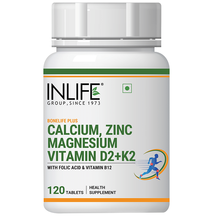 Inlife Bonelife Plus Calcium, Zinc Magnesium Vitamin D2+k2 with Folic Acid & Vitamin B12 Tablet is a vegetarian supplement in one easy to swallow tablet. It is ideal for promoting bone, muscle, and nerve health. Vitamin D assists in calcium absorption and helps in maintaining a healthy immune system. Zinc helps in metabolism and supports growth. Magnesium supports healthy nerves and muscles. Calcium and Vitamin D are essential nutrients for strong teeth and bones. | Key Ingredients: 250mg of Elemental Calcium 100mg of Magnesium 10mg of Zinc 118mcg of Folic Acid 55mcg of Vitamin K2 (as MK-7) 400 IU of Vitamin D2 1mcg of Vitamin B12 | Key Benefits: Vitamin D assists in calcium absorption and helps to maintain a healthy immune system Zinc helps in metabolism and supports growth Magnesium supports healthy nerves and muscles Calcium and vitamin D are essential for strong bones and teeth | Directions For Use: Take 1 tablet daily after meals or as advised by your healthcare professional. | Safety Information: Read the label carefully before use Store in a cool and dry place away from direct sunlight Keep out of reach of the children