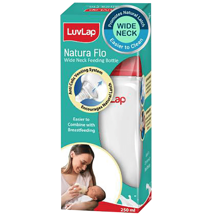 LuvLap Natura Flo Wide Neck Feeding Bottle comes with an anti-colic valve designed to vent air into the bottle and not the baby's tummy. The natural latch wide base silicone teat with grooved design aids natural like latch on. Luvlap cares about the little ones, just as much as you. The well being of your child is their prime motive. | Uses: It is used in feeding milk to babies at home or in public areas. | Product Specification and Features: 100% PP Feeding Bottle that is BPA Free Liquid Silicone Teat with advanced anti-colic valve Spiral Grooved Nipple for a comfortable latch The shape of the bottle is comfortable and easy to use with no nipple collapse | Directions For Use: Angle the bottle so the neck of the bottle and the nipple stay full of milk This helps reduce how much air your baby swallows Do not prop the bottle in your baby's mouth or let him or her hold it alone This increases your baby's chances of choking or getting ear infections | Safety Information: Read the label carefully before use Keep out of reach of the children Store in a cool dry place Recommend to change teat after every 3 months for hygiene reasons