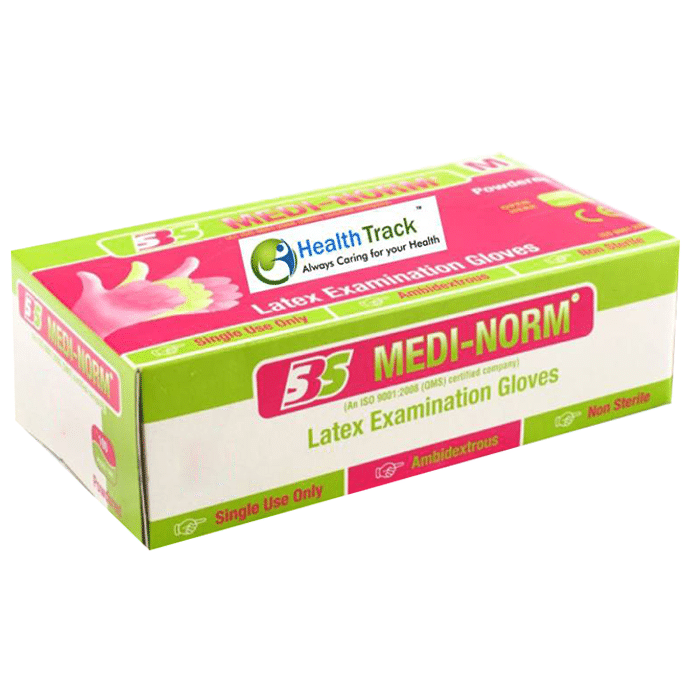 Medi-Norm Latex Examination Glove is disposable gloves used during medical examinations and procedures to help prevent cross-contamination between caregivers and patients. | Uses: It is used during diagnosis and medical procedures and helps to prevent infections and contagious diseases through direct contact. | Product Specification and Features: These gloves create a barrier between skin and bio-hazardous waste such as saliva, blood, urine etc. Protects from infections and germs Comfortable and easy to use for a longer duration | Directions For Use: Pull out the gloves from the pack and wear them correctly on the hands. | Safety Information: Read the label carefully before use Store in a cool dry place away from direct sunlight Keep out of reach of the children
