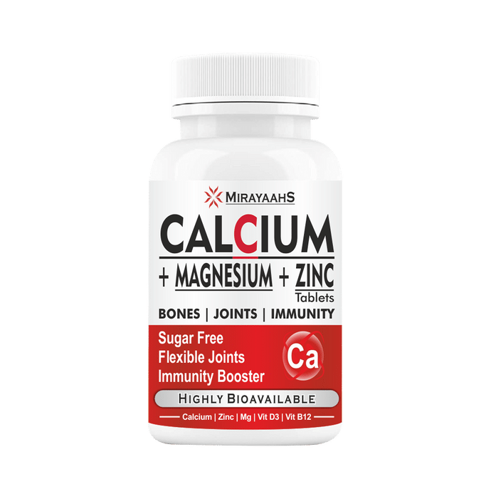 ~Mirayaahs Calcium+Magnesium+Zinc Chewable Tablet~ is a high-absorbable calcium supplement that promotes cardiovascular health. Calcium tablets for men and women support bone health, muscular health and joint health. The activities of vitamin K2 may aid to preserve arterial health, which is vital for overall cardiovascular health. Cissus quadrangularis extracts, a good source of calcium, can help people with various forms of bone fractures reduce pain and swelling while also speeding up the healing process. ~Key Ingredients:~ |Curcuma long root extracts| |Curcumin C3 complex| |Ginger root ext| |Piperine| ~Key Benefits:~ |These calcium magnesium zinc tablet is beneficial for muscle, bone and joint health| |It contains zinc and magnesium that helps the body recover faster, uplift mood and make the body feel rejuvenated| |Vitamin B12 helps to provide nourishment to bones, protects hair and skin health| |Zinc present in these tablets helps in healthy cardiac, muscle and nerve function| |Magnesium is added to assist normal, healthy heart, muscle and nerve function, while zinc aids immune system function and vitamin B12 aids energy-yielding metabolism| ~Directions For Use:~ Use as directed on the label. ~Safety Information:~ |Read the label carefully before use| |Store in a cool and dry place away from direct sunlight| |Keep out of reach of children