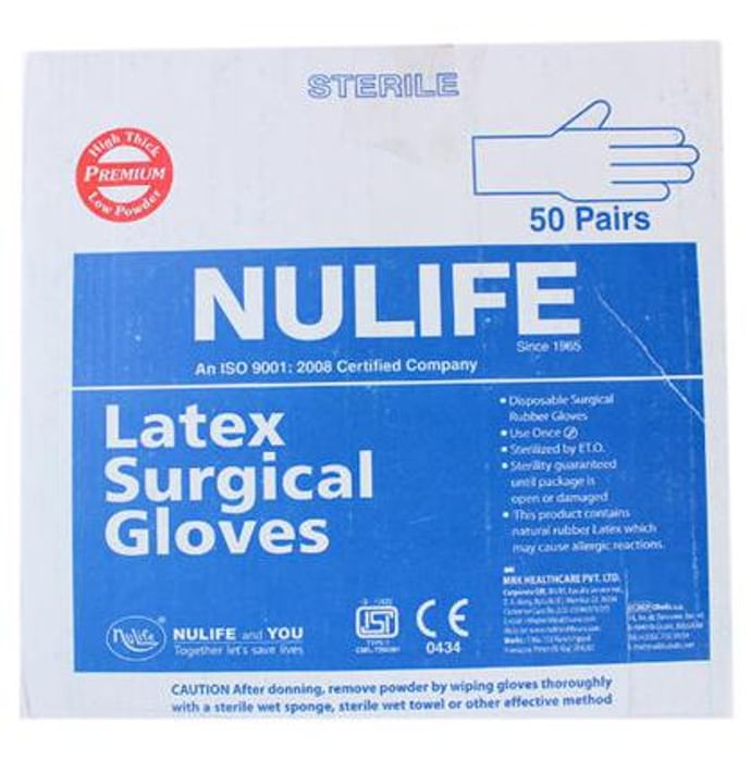 Nulife Sterile Powder Free Surgical Gloves 6.5 offer excellent dexterity and promotes enhanced comfort and flexibility. The extractable NR latex protein content of the gloves is less hence it aids in reducing the chances of skin allergies and helps prevent skin allergies. | Uses: The surgical gloves act as a protective barrier preventing possible transmission of diseases between healthcare professionals and patients during surgical procedures. | Product Specifications and Features: It is made using natural rubber latex and has lower modulus for better comfort The design features hand specific, beaded cuff and micro-rough texture These gloves are chlorinated/polymer coated free of powder preventing skin irritation The sterilization is ethylene oxide/gamma irradiated as per customer requirement Minimum extractable NR latex protein content is used to prevent skin allergies These gloves are thick promoting enhanced safety | Directions For Use: Take your dominant hand glove and place it onto your dominant hand then slip on the second glove and adjust your gloves. | Safety Information: Read the user manual carefully before use Keep out of the reach of children Store in a cool dry place away from direct sunlight