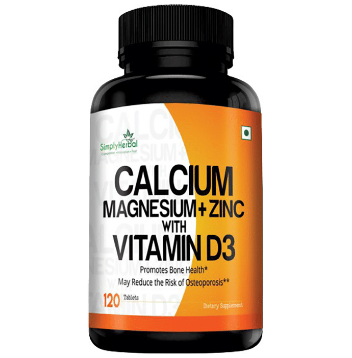 Simply Herbal Calcium Magnesium + Zinc with Vitamin D3 Tablet Calcium is an essential mineral that can help build strong bones. Magnesium may help prevent calcification of soft tissue which can help prevent bone loss and aid in calcium absorption. Zinc may aid bone formation, appetite regulation, eye health and immunity. | Key Ingredients: Calcium Vitamin D3 Magnesium Zinc | Key Benefits: It can be helpful for osteoporosis and joint inflammation It may improve bone health by maximising healthy bone density It is formulated for better absorption of joint pain and stiffness It can promote bodybuilding and support sports activities It may alleviate muscle cramps It can strengthen the nervous system and boost immunity | Directions For Use: Take 2 tablets daily with water at meal time or as directed by the healthcare professional. | Safety Information: Pregnant or nursing mothers, children under the age of 18, or individuals with a known medical condition should consult a physician before using this or any dietary supplement Do not exceed the recommended dosage Keep out of direct sunlight Store in a cool and dry place Keep out of reach of children