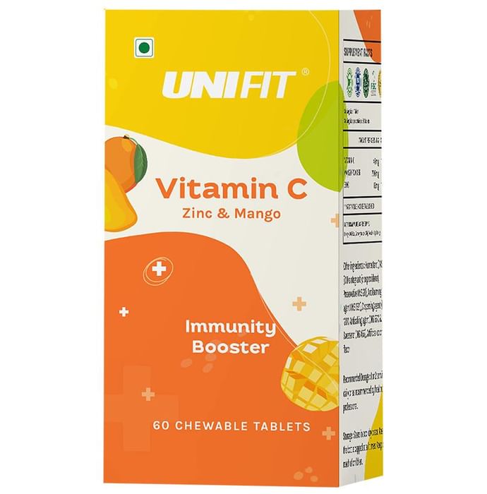 Unifit Vitamin C with Zinc & Mango Chewable Tablets It is a dietary supplement enriched with vitamin C and zinc to support and improve your immune system. Vitamin C or ascorbic acid is vital for the growth, development and repair of all body tissues. It's involved in many body functions, including the formation of collagen, absorption of iron, and proper functioning of the immune system. It helps to protect your body against any oxidative stress and supports heart health. | Key Ingredients: Vitamin C Zinc Mango extract | Key Benefits: It is a dietary supplement that supports and improves your immune system Vitamin C or ascorbic acid is vital for the growth, development and repair of all body tissues It is involved in many body functions, including the formation of collagen, absorption of iron, and proper functioning of the immune system Vitamin C is an essential antioxidant necessary for blood clotting and collagen synthesis It is necessary for healthy connective tissue, gums, teeth and bones It contains antioxidants which can protect against free radicals and boost your immune system Zinc plays a crucial role in enhancing heart health by improving healthy cholesterol levels It supports the eye health, mood and mental well-being of an individual Zinc enhances ‘T’ cells which are necessary for immune system response Mango contains magnesium and potassium, which help maintain a healthy blood flow. It helps blood vessels to relax and lowers blood pressure levels | Directions For Use: Take 1-2 tablets daily or as directed by your physician | Safety Information: Read the product label carefully before use Store in a cool and dry place away from direct sunlight Keep out of reach of children Consult a doctor before taking any supplement Do not exceed the recommended dosage Pregnant or nursing mothers, children, and people with medical conditions must consult a physician before taking this supplement Do not use if the product appears to be tampered with or the seal is broken
