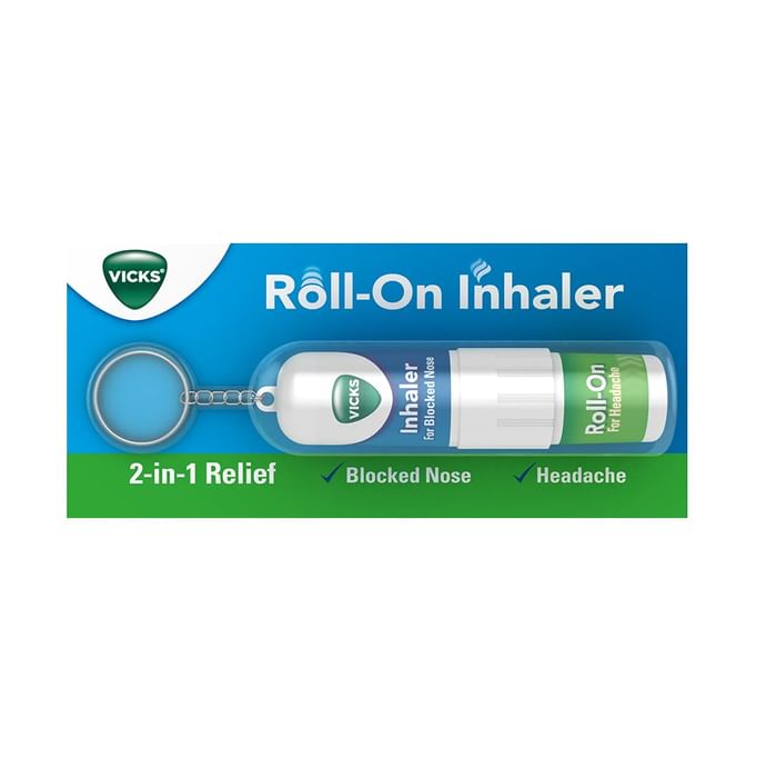 Vicks Roll-On 2 In 1 Relief Inhaler Introducing the new Vicks inhaler and roll-on. It’s got an Inhaler, which unblocks the nose, on one side and a Roll-on, which gives relief from headaches, on the other. | Key Ingredients: Pudinah (mentha arvensis, Lf.) Karpoor (pinus longifolia, St.) Fragrances q.s. | Key Benefits: Relieves headache and blocked nose It comes with a key chain for easy carry anywhere and anytime It is two products in one design | Directions For Use: For blocked nose relief- Breathe deeply using an inhaler from the nostrils For headache relief- Apply roll-on on affected areas | Safety Information: Read the label carefully before use Store in a cool and dry place, away from sunlight Keep out of reach of children More than one person should not use it For 6 years and above Consult a doctor before use if pregnant/breastfeeding Avoid contact with eyes and don't use it on broken skin For external use only