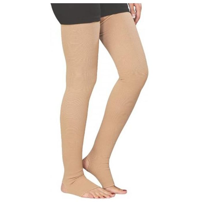 Hiakan International Varicose Vein Stocking Thigh Support are therapeutic socks made of material that helps in preventing the occurrence of varicose veins, further progression of venous disorders such as edema, phlebothrombosis, cramp and numbness of legs. | Uses: Minimised symptoms related to venous insufficiency which causes blood to flow in the wrong direction. Suited for people who spend long hours standing, sitting, travelling on aeroplanes or for people who suffer from heavy, achy or restless legs. | Product Specifications and Features: Prevents venous blood from pooling in the legs and thereby decreases the risk of blood clots Improves blood circulation and is beneficial for people suffering from inflamed veins Used to prevent occurrence of varicose veins and provides graduated compression to ankle, calf and knee It provides relief to tired, achy legs and decreases numbness in legs | Directions For Use: Use as directed by the physician. | Safety Information: Read the label carefully before use Keep out of the reach of children Use under medical supervision