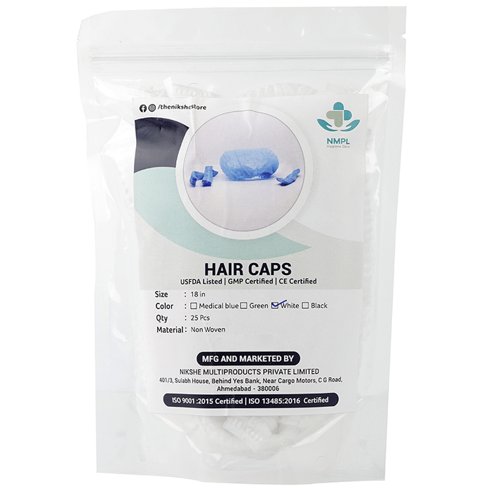 NMPL Hair Cap is composed of non-woven fabric that can withstand even the tiniest particles and it is wrapped around the head with an elastic grasp. They are comfortable to wear, lightweight, and do not cause discomfort even when worn for a long period. | Uses: It is used as caps by surgeons to prevent the falling of any dust particles during surgery. | Product Specification and Features: These caps are lightweight and provide complete coverage of the head and hair These caps can be used by doctors and nurses during surgery It has good water resistance and air permeability It provides relief and dryness. It also possesses antibacterial and antifungal properties | Directions For Use: Use as directed on the label. | Safety Information: Read the label carefully before use Store in a cool and dry place away from direct sunlight Keep out of reach of children