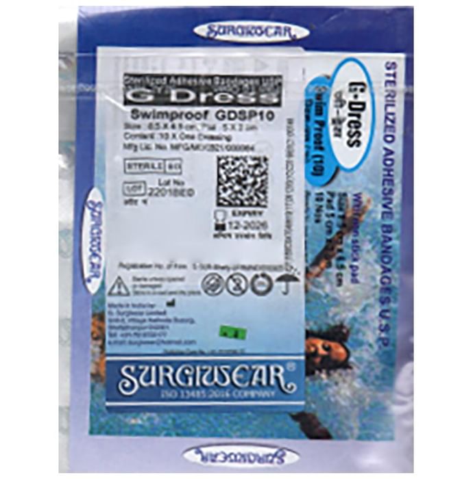 Surgiwear G Dress Swimproof GDSP10 Bandage is a ready-to-use wound dressing that has been sterilised. The intermediate layer of this nonwoven fabric prevents moisture from going through. It shields the dressing from moisture. Bathing on a regular basis is not harmful to the dressing. The skin's regular breathing and the passage of water vapour are unaffected. This dressing is not stretchy. A non-stick substance is used to line the wound pad. The pad will not cling to the wound as much. The adhesive is non-irritating to the skin. | Uses: It is a sterilised adhesive bandage which is a ready to use wound dressing and keeps the wounds protected against water and moisture. | Key Specifications and Features: The G-Dress Swimproof Bandage is made of wide apertured nonwoven material The size of the bandage is 8.5x6.5 cm and the pad size: is 5x3 cm The feel is soft and comfortable due to its light stretchability It protects wounds from developing any bacterial infection and aids in keeping them intact It is made from non-woven fabric that prevents any moisture to pass through it The wound pad is covered with non-stick lining that will prevent sticking of the pad with the wound It is slightly stretchable in both the directions and is coated with skin-friendly acrylic adhesive | Directions For Use: Peel open the pouch, remove the release paper and apply a non-stick pad (white) covering the wound area. | Safety Information: Read the label carefully before use Store in a cold and dry place Keep away from the reach of children