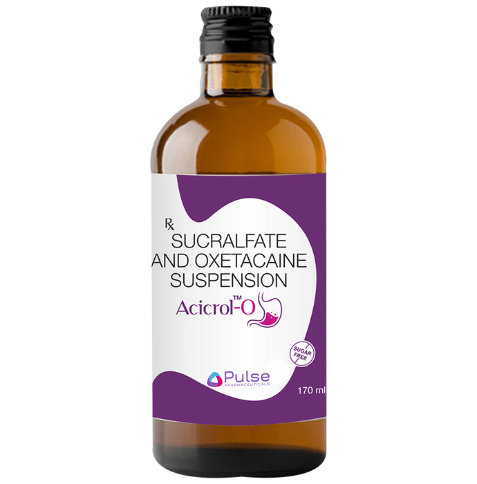 In Treatment of Acidity Acidity is a condition when your stomach produces more acid than is needed for the digestion of food. Acicrol-O Oral Suspension Sugar Free helps treat acidity. Acicrol-O Oral Suspension Sugar Free gives relief from burning sensation and stomach pain associated with acidity. In Treatment of Heartburn Heartburn is a burning feeling in your chest caused by stomach acids travelling back up towards your throat and mouth. Acicrol-O Oral Suspension Sugar Free works by reducing the amount of acid your stomach makes and relieves the burning sensation and pain associated with heartburn. You can also take control of heartburn with few lifestyle changes. Think about what foods trigger heartburn and try to avoid them; eat smaller, more frequent meals; try to lose weight if you are overweight and try to find ways to relax. Avoid eating within 3-4 hours of going to bed. In Treatment of Stomach ulcers Stomach ulcers are painful sores that develop in the inner lining of the stomach. Acicrol-O Oral Suspension Sugar Free is used to treat stomach ulcers. Acicrol-O Oral Suspension Sugar Free covers the damaged ulcer tissue in the stomach and protects it against stomach acid or further injury. This helps ulcers heal more quickly. $also gives relief from pain and discomfort in the stomach associated with stomach ulcers. You need to keep taking the medicine as it is prescribed for it to be effective, even if the symptoms seem to disappear.