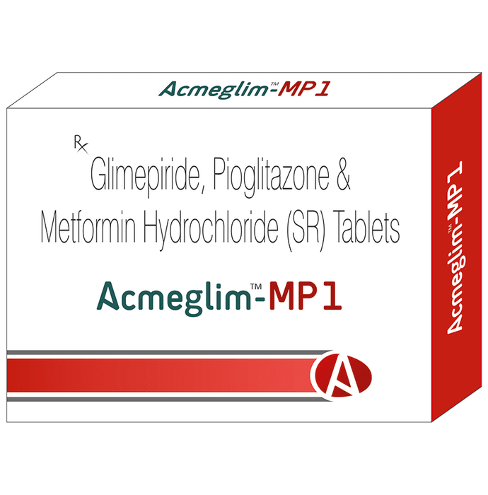 Acmeglim-MP 1 Tablet SR is a combination medicine that helps control blood sugar levels. This medicine is used together with diet and exercise to improve blood sugar control in adults with type 2 diabetes mellitus. It helps in proper utilisation of insulin, thereby lowering the blood sugar levels. Acmeglim-MP 1 Tablet SR should be taken in the dose and duration as advised by your doctor. It must be taken with food to avoid stomach upset. If you miss a dose, take it as soon as possible. However, if it is almost time for your next dose, skip the missed dose and go back to your regular schedule. Do not double the dose. Overdose may lead to low blood sugar (hypoglycemia). Some people may develop hypoglycemia (low blood sugar level) when this medicine is taken along with other antidiabetic medicines, alcohol or upon skipping a meal. Monitor your blood sugar levels regularly while taking it. Other common side effects of this medicine include nausea, taste changes, diarrhea, stomach pain, headache, edema (swelling), blurred vision, bone fracture, and respiratory tract infection. Before taking this medicine, inform your doctor if you have any kidney, liver or heart problems. Pregnant or breastfeeding women should also consult their doctor before taking it. Your doctor will check your kidney function tests before starting treatment with it. Avoid excessive alcohol intake while taking it as this may increase the risk of developing some side effects.