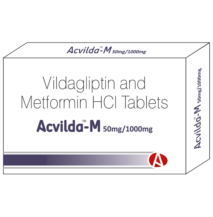 Acvilda-M 1000mg/50mg Tablet is a combination of two medicines that control high blood sugar levels in people with type 2 diabetes mellitus. This helps prevent serious complications of diabetes such as kidney damage and blindness and may also reduce your chances of having a heart attack or stroke. Acvilda-M 1000mg/50mg Tablet can be prescribed alone or together with other diabetes medications. All diabetes medicines work best when used along with a healthy diet and regular exercise. The dose you are given will depend on your condition, blood sugar levels, and what other medicines you are taking. Taking it with meals helps to reduce the chances of developing an upset stomach. You should take it regularly, at the same time each day, to get the most benefit and you should not stop unless your doctor recommends it. It is controlling your blood sugar levels and helping to prevent serious complications in the future. It is important to stay on the diet and exercise program recommended by your doctor while taking this medicine. Your lifestyle plays a big part in controlling diabetes. The most common side effects of taking this medicine include diarrhea, nausea, vomiting, upset stomach, headache, and sore throat. Low blood sugar level (hypoglycemia) is a possible side effect if you are also taking other diabetes medicines like insulin or sulphonylurea, so you need to know how to recognize and deal with it. This medicine is not suitable for everyone. Before taking it, you should let your doctor know if you have ever had kidney, liver, or heart disease, problems with your pancreas, or if you drink a lot of alcohol. Pregnant or breastfeeding women should also consult their doctor before taking this medicine. Some other medicines can affect this one so tell your doctor about all the medicines you are taking to make sure you are safe. You should try to avoid drinking alcohol as it lowers blood glucose. Your doctor will check your kidney function and blood sugar levels before and during treatment.